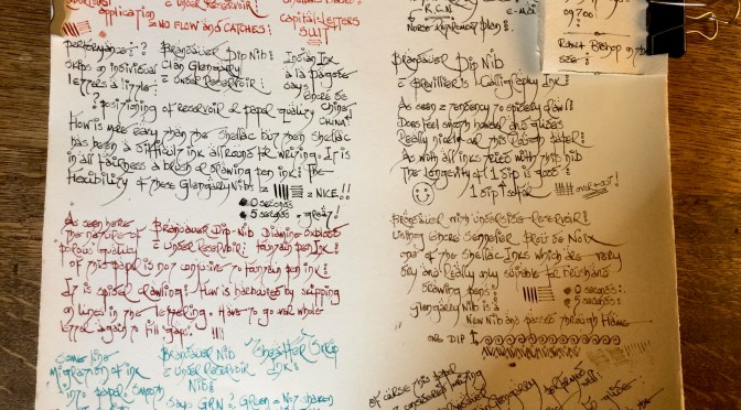 Simple meanderings using the Brandauer dip nib with various inks. Have put a small Mitchell ink reservoir on the underside of the nib. The nib is a ’Fude’ nib. Upturn at the nib end. One immersion into each ink produces a nice elongated writing experience.