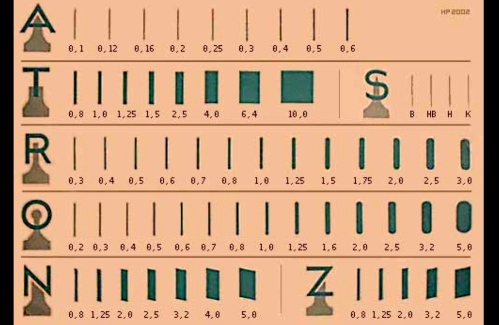 The ‘A’ nib collection I have here is a strange experience when putting nib to paper. The nibs are a double ‘skin’ where top upper piece can rotate out of the way of the bottom nib plate in order to clean thoroughly. Needed because the inks are rather akin to the dryness of India inks.