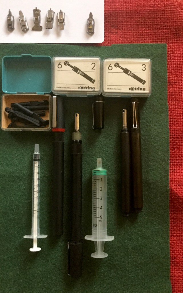Here, having written after filling from a 23ml container of black Rotring ink it was seen to be fairly grey. Old probably. Did shake the container in case separation existed. Whether it is because I have cleaned the stained systems in the Rotring cleaner fluid and followed by water washout due to harsh dry debris being present. This producing a lighter ink due to the need to get the pen unit possibly drier. Filling requires a syringe. Easier to take out the plastic 1, 2 or 3 flow feeds and syringe into the reservoir. About 1 ml is all I used. A messy business if it spills all over your fingers and hands.