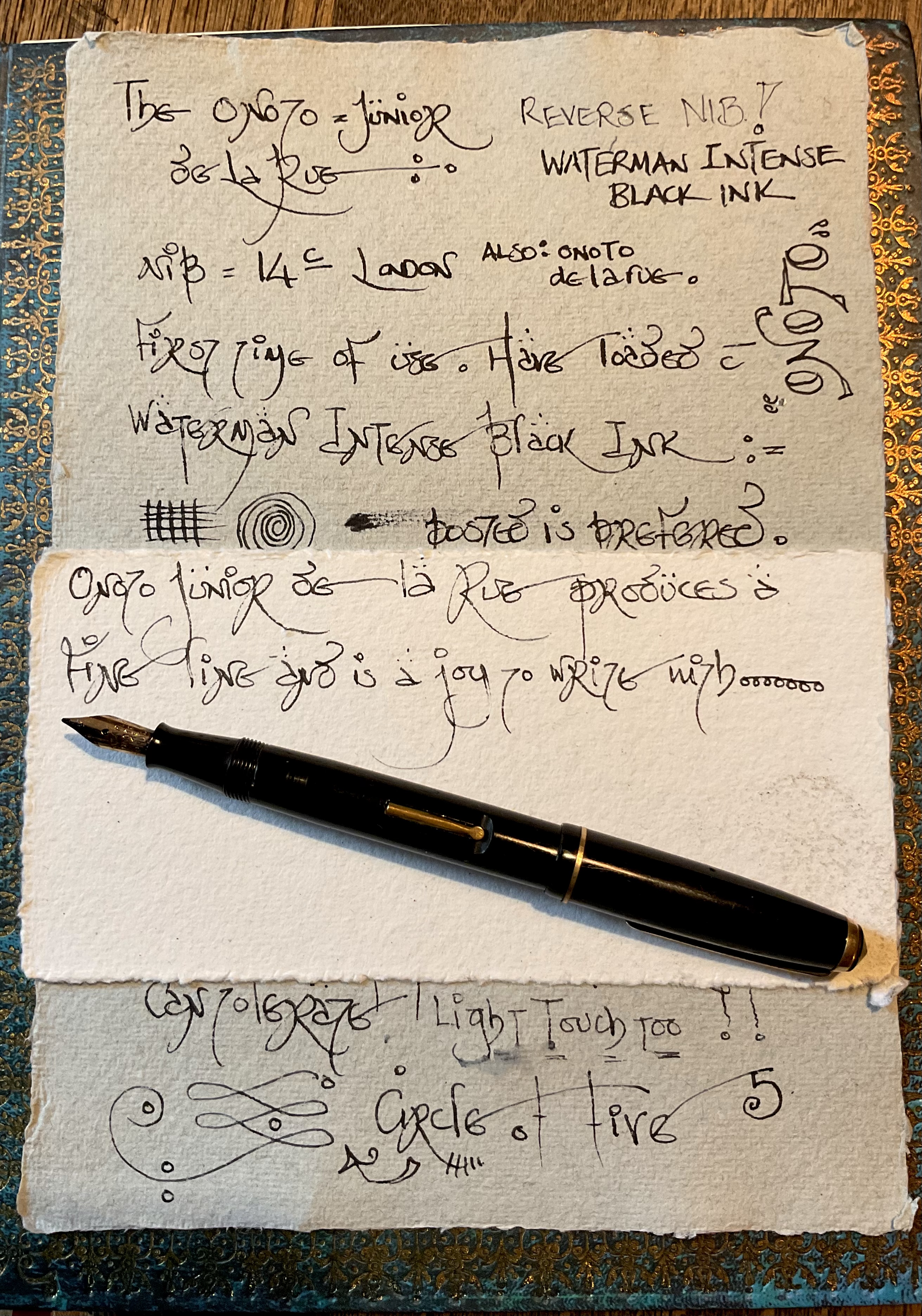 I now have an Onoto Junior de la rue and simply……..it is enough. Yes, I do possess more than one in certain makes. I have two Waterman, four Parker, a few italic choices with interchangeable nibs, etc. However it is because you enjoy the pen qualities in the script it can produce. A particular make has a fine or medium nib. A stainless steel, iridium or gold nib. You realise it has a flagship model that is raved about and interest is tweaked. Or. You own a specific make where the model you have is a beautiful performer and that’s enough. You get a pen that is a disappointment? Pass it on to someone who may well love it and find it perfection. And yes. I do mean give it away.