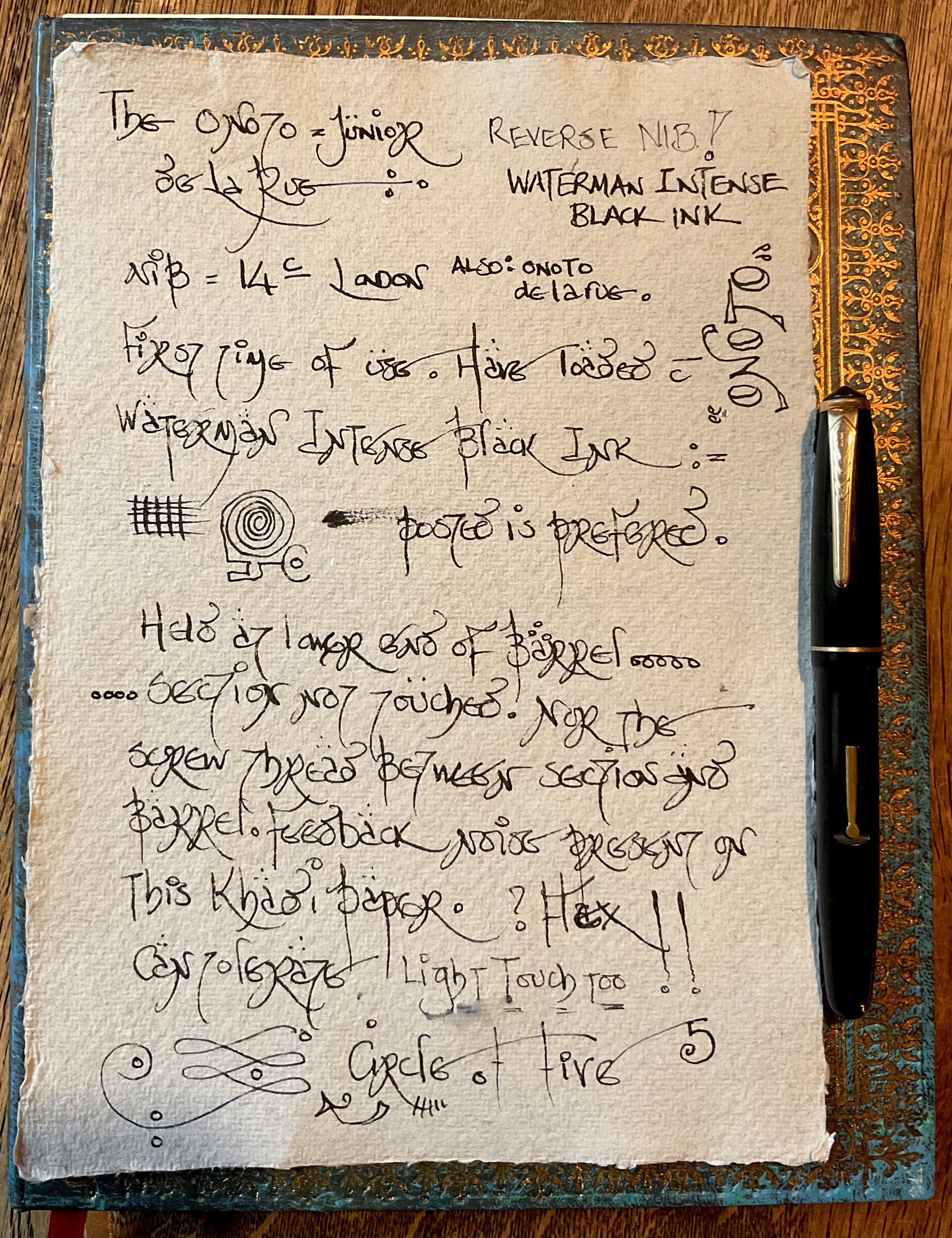 The Onoto Junior de la rue fountain pen has arrived. Quite excited about this particular fountain pen. So it arrived in the post, given a quick once over look, grab a bottle of Waterman Intense Black ink, fill her up, grab a sheet of light sage green Khadi hand made paper and see what happens. Then, closed eyes, a deep breath to relax and begin. Just simply put down the normal routine of naive description.