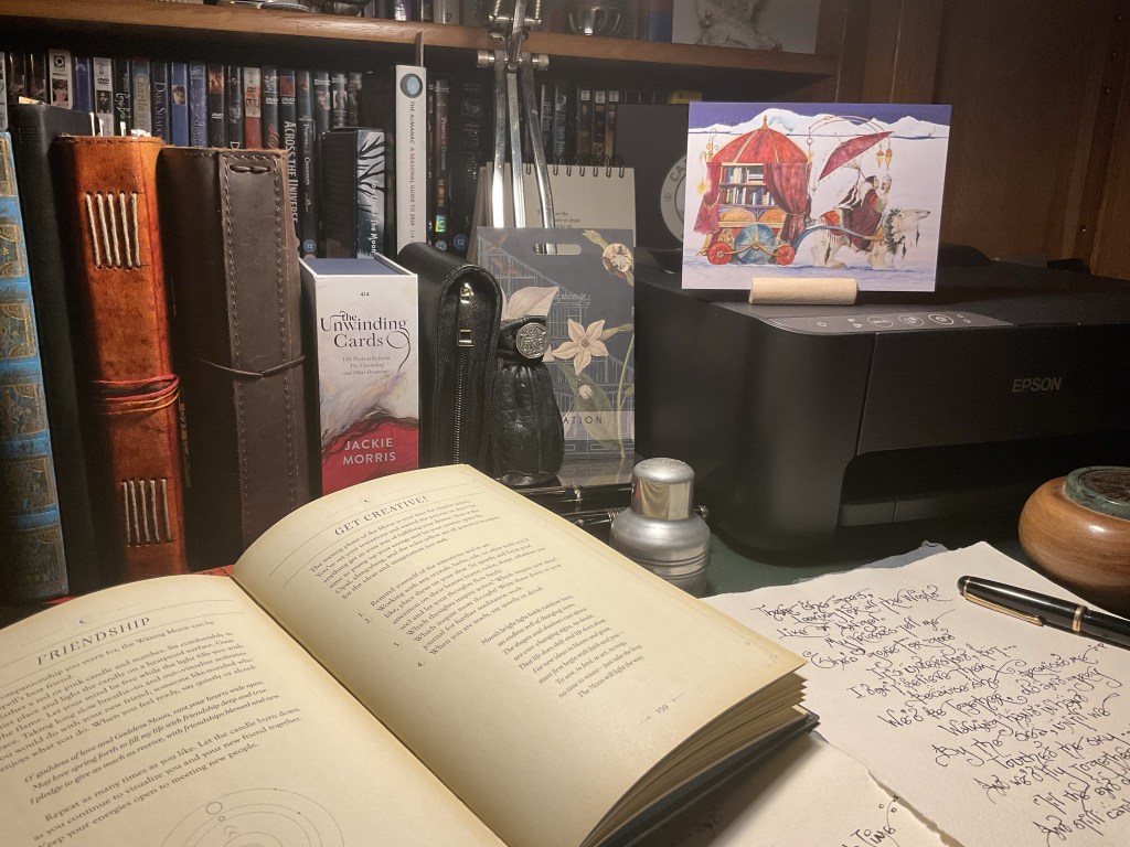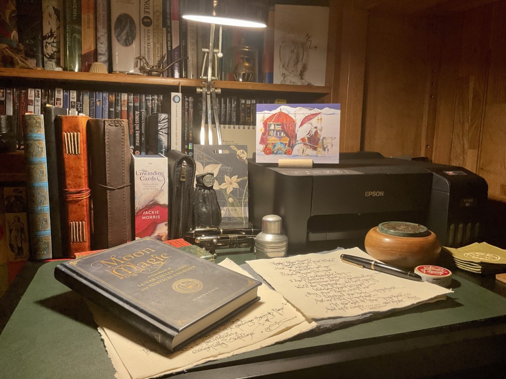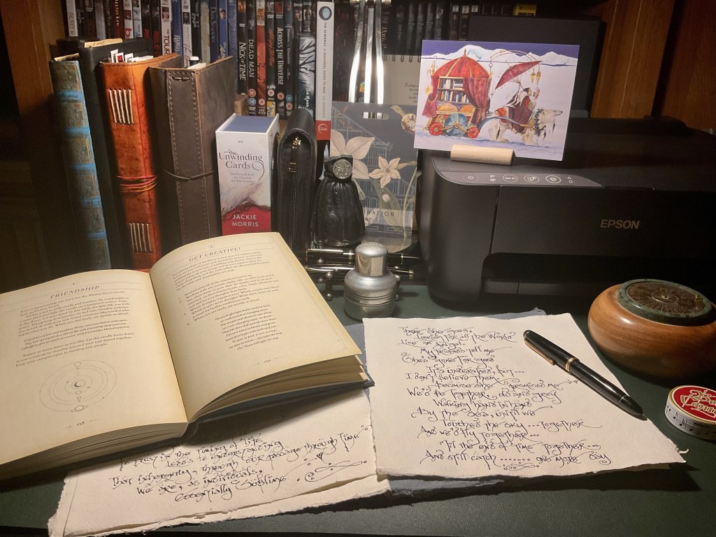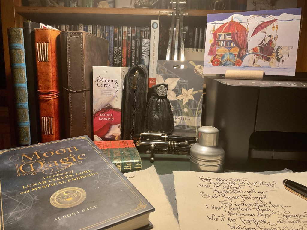 Love the new old desk/old new desk… love the Moon Magic book and as always your writing with script lettering. Ah, so much to touch on here. It seems the songwriting is coming along—great!