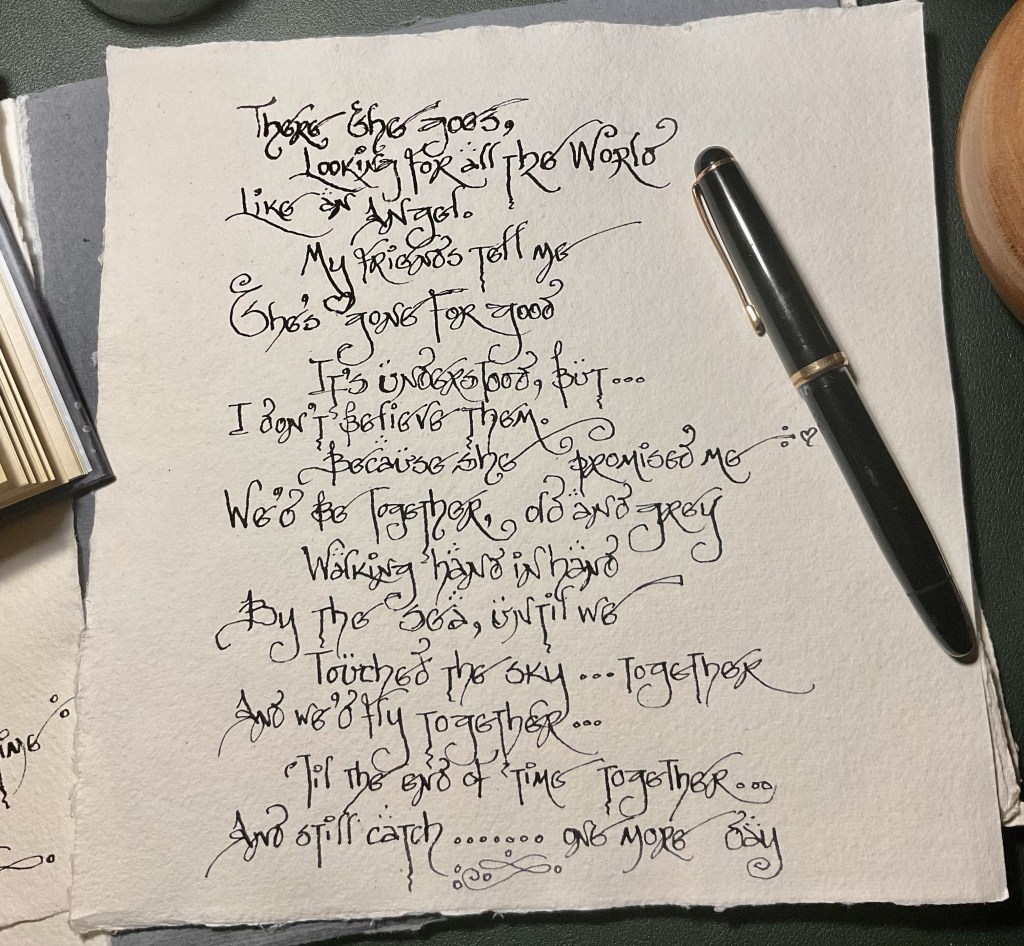 Thank you. The handwriting is born from an early age. I remember in primary school being asked to focus because a TyPhoo tea competition was being entered in the school. They thought I would do okay. I tried too hard to be spot on and I didn’t win. So, after that it was a case of just go with whatever felt comfortable and enjoy writing for its own sake. I suppose I had no more expectations. So I just simply write like this all the time. It has changed over and over as shapes of letters get played with. The ‘clock’ song is one I have written a new tune to recently. Sang it to the guitarist and drummer by sending by iPad recording to Spain and a few hundred miles down the road here in the UK. It’ll work well I believe. Technology hey! Glad you like the words. Cheers Destiny.