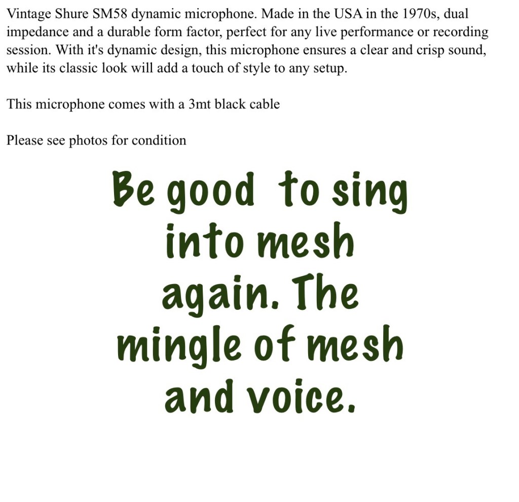 I am a fan of a guitarist called Francis Dunnery. I was looking at how he records guitars/vocals on YouTube and it turned out as a really insightful piece of spoken advice. He said after 1980 the Shure SM58 simply does not match up to the USA made ones made up to 1980. I read they started making them in China but not sure of the date. Francis was saying they were not the same at all. Design was exact as per Shure, but he just knew they had changed performance quality and lost the gold standard. I’m not technical at all, so can proffer no knowledge really. But I used this same microphone in the band days and loved the ambient results. So looked for a vintage one. On eBay, USA vintage prices can be quite an eye opener. Cheers and good wishes.