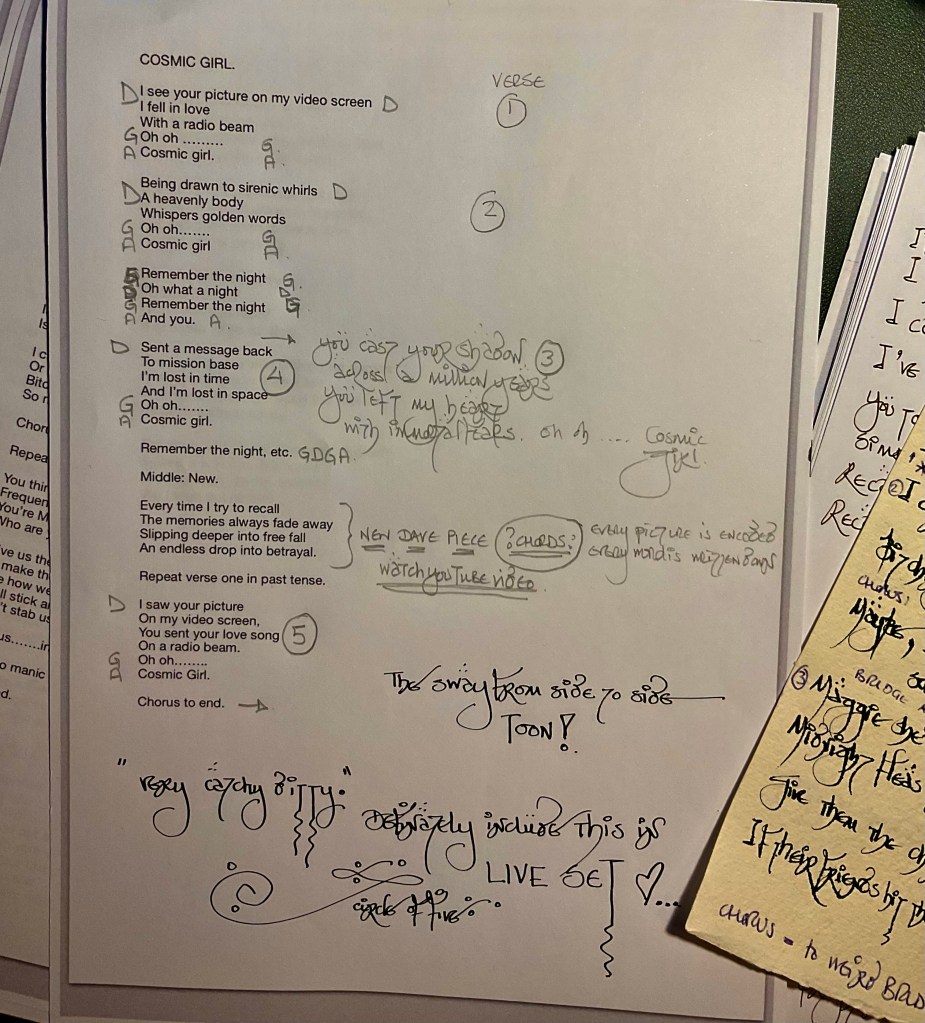 Love it! The first photo of Cosmic Girl lyrics with chords and your artful additions… swirls… enchanting.