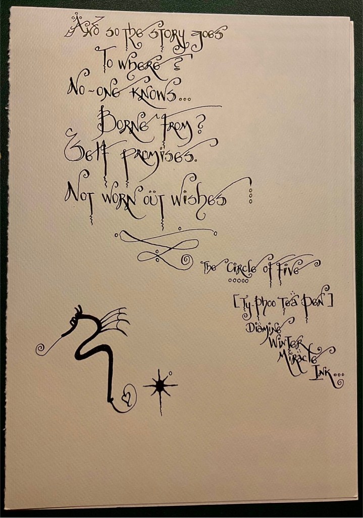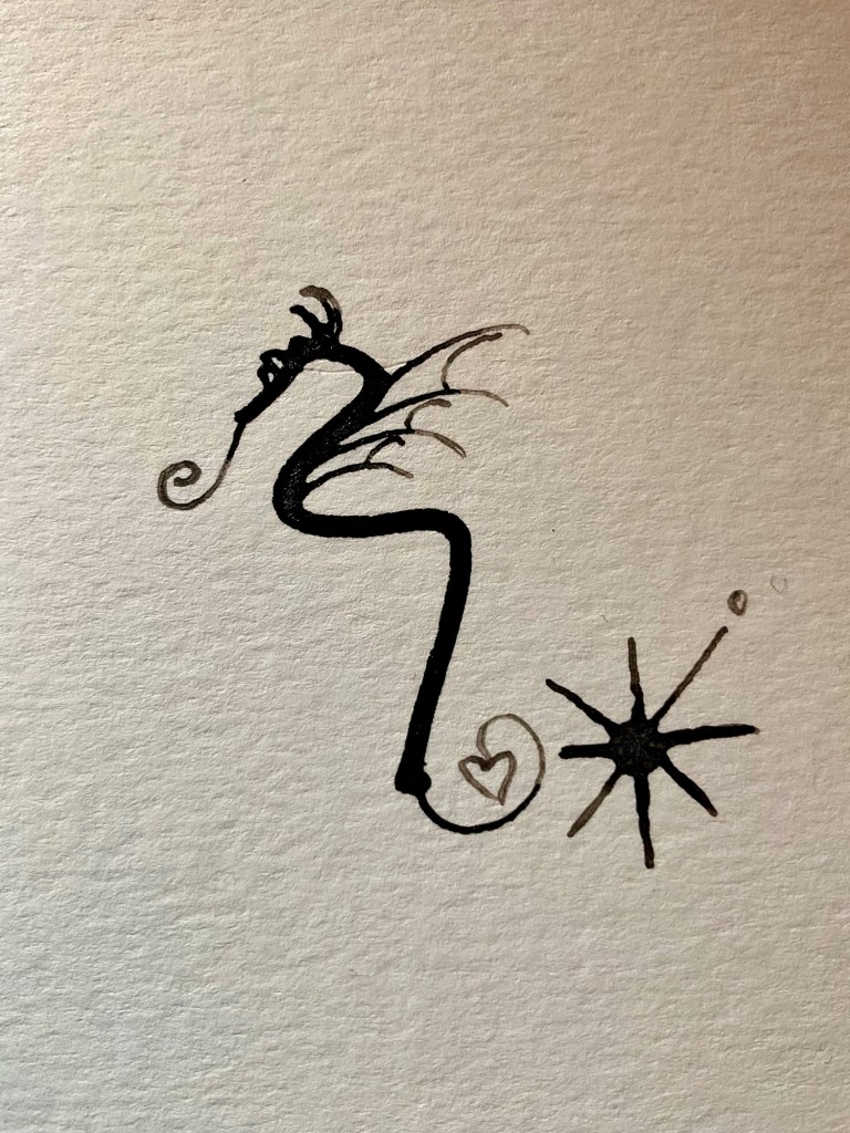 2023 brought a little Skwiggle Dragon into life. A simple 20 seconds result from a mistake of wondering how this new purchase of Pelikan art ink in a small plastic bottle, when squeezed, works on paper. The quick output of ink resulted in a subsequent other ‘quick’. ‘Quick! Do something’. Happened from the introduction of ink from skweeze-ing the bottle to available paper without prior deliberating outcomes of speed of delivery. The wet deep inky blackness spilled out and needed a flash of ‘Gosh! Unexpected! Very unexpected. Please don’t let me waste the paper or the ink’. Again, with uninformed improvisation ….’Quick! Turn that reverse S into something….anything’. Then grabbing a dip nib worked on the black wetness with simplicity of lines. Result? Skwiggle the Dragged Out, from said reverse S line, Dragon.