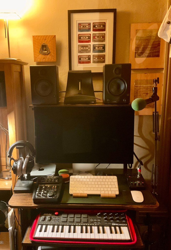 Beyerdynamic headphones, Shure SM58 1970s microphone, Apple Mac M2 mini Pro, Studio Display Monitor and Akai MIDI keyboard.