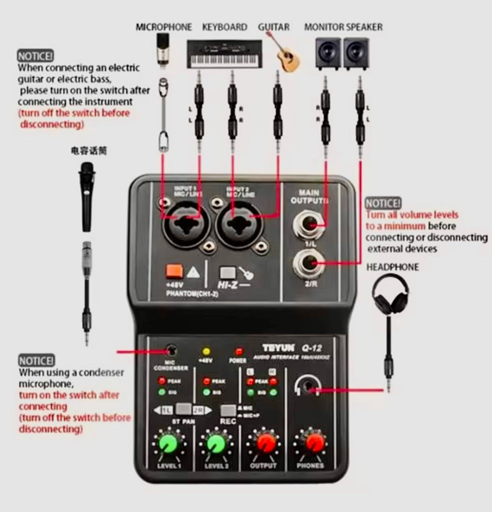 I bought an Audio Interface off Amazon. (below image and right side below in my taken photograph) It goes directly into the Apple Mac mini M2 Pro USB port. All the recordings you hear of mine (on this GarageBand/Apple Mac mini M2 Pro combination) concerns the electric guitars plugged directly into the interface with a 1/4 inch jack lead. The acoustic guitar is played through a microphone which is also plugged directly in to the audio interface. Microphones are either condenser or dynamic. And are each connected with their own different types of plugs. XLR, 1/4 inch jack plugs, USB-C or USB. A USB standard connector lead to computers came with this audio interface. Doesn’t use mains to drive it, so no mains plug. Plug the USB into the Mac M2 and it’s ready and good to go.