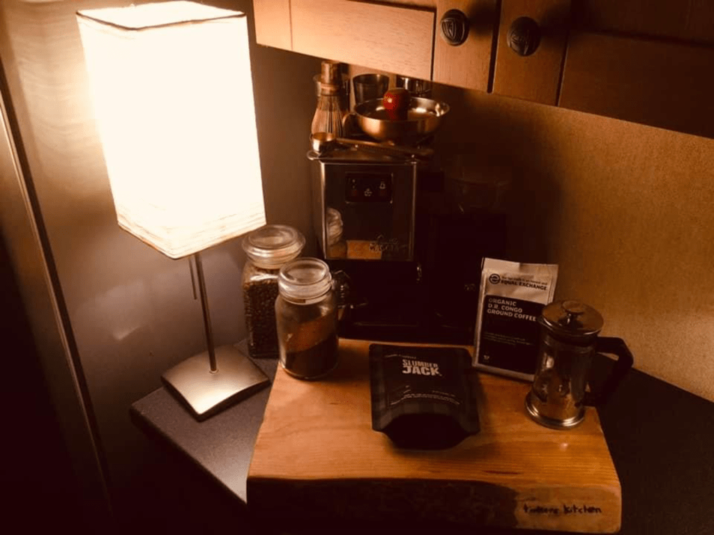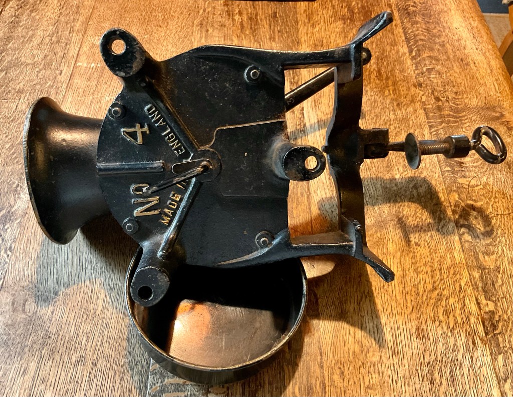 Grinding beans. I do own a couple of hand grinding vintage Spong machines. A #2 and the larger #4. Also an electric grinder too. The Spong is better for producing beans with nicer flavour. No heat produced and affecting the beans like the electric grinder. The electric grinder is a decent make however. So grind desired coarseness consistency is always achieved. It’s just that my wife has commandeered the heavy wooden butcher’s block station that housed the heavyweight Spong. It is now in her shop. So I currently have no place to clamp down the #4 beast permanently. It will almost certainly find a place soon though! The kitchen is due a DIY overhaul. The #2 is a permanent in the VeeDub.