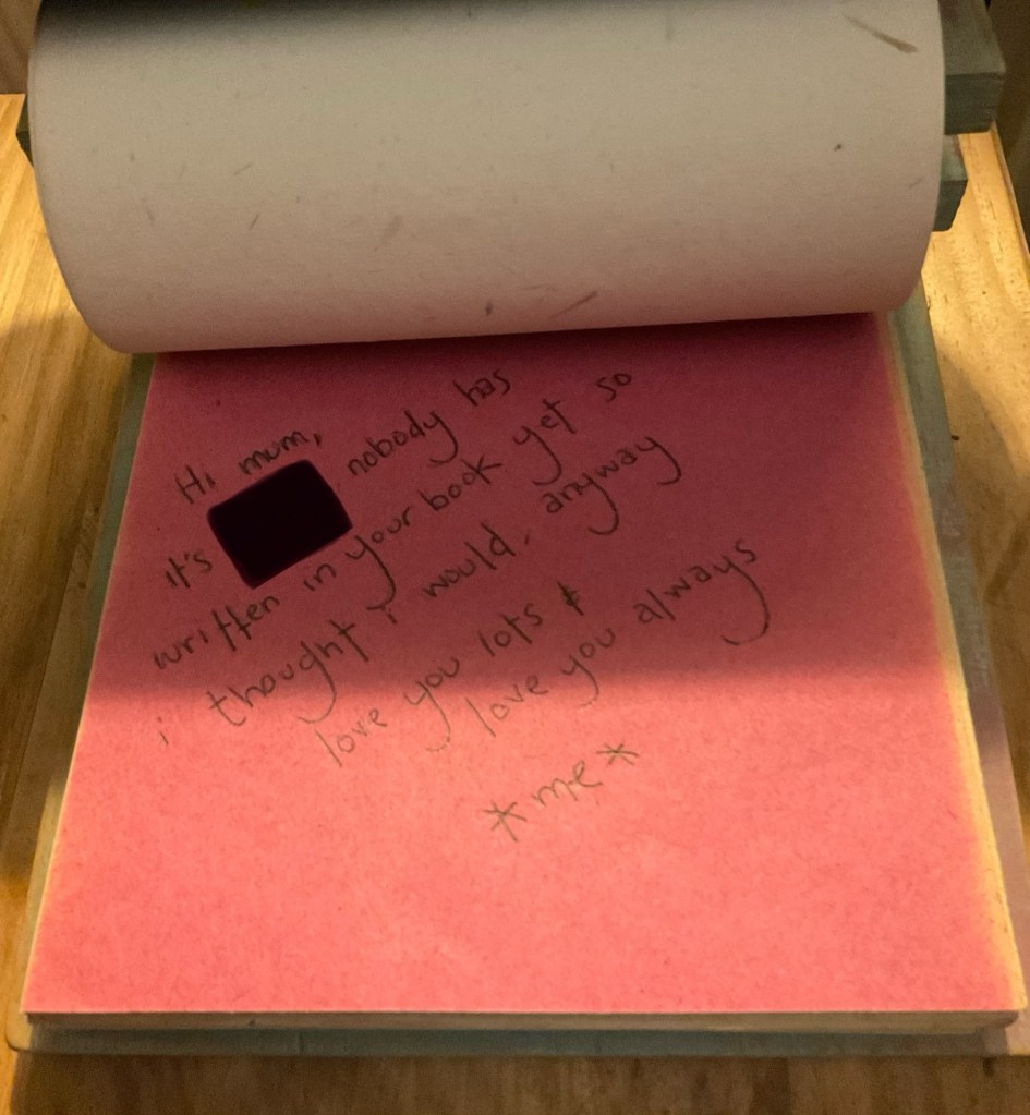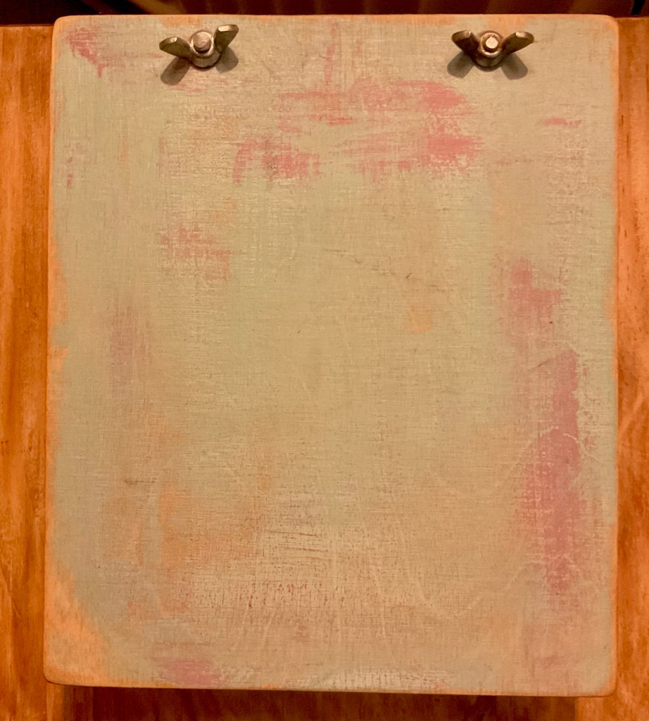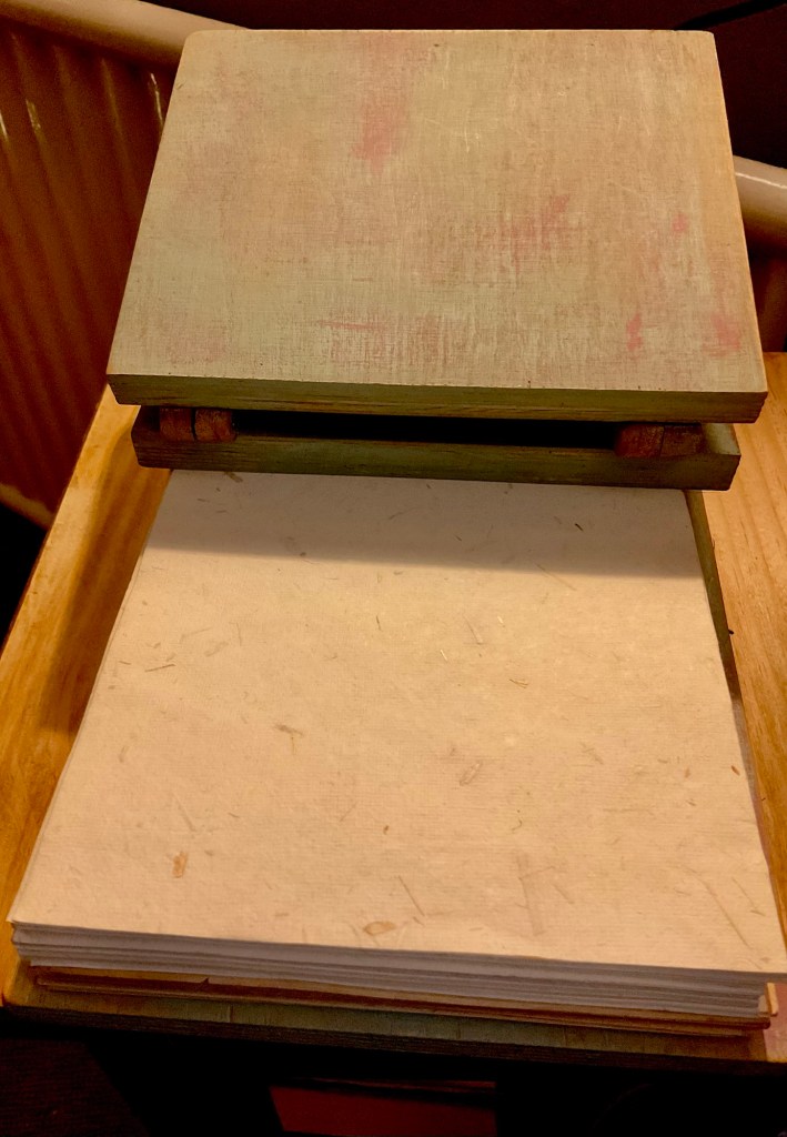 Very many moons ago I made a wooden ’journal’ or even a ‘telephone message pad’ for my wife for Valentine’s Day. Painting it and then distressing the look by applying sandpaper to rub back the whole ‘painted on two different coloured layers’ look. Then subsequently Briwax-ed the finish. It was fun working with wood which was recycled. I would love to now house handmade paper inside totally. However, inside are 3 small past message entries from my daughter at a younger age and 2 from the grandchildren. All other pages are blank. So will leave it as it is. My wife’s daily writing is in her diary. So this was never a journal possibility in reality. I buy a diary for her every Christmas. So she never used this wooden impractical gift with intent. She loves the application of my making this sentiment though.