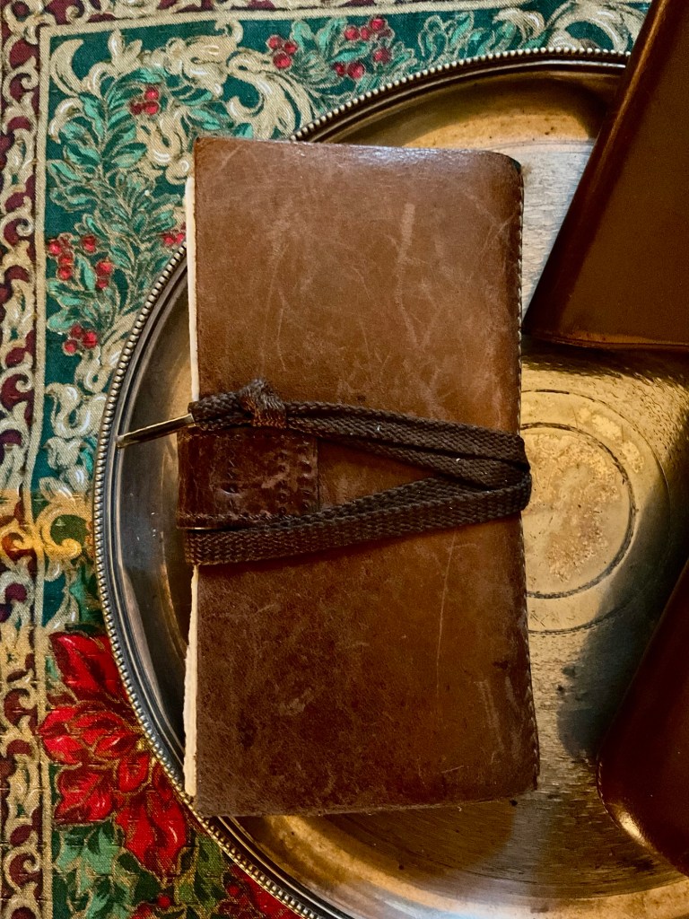 In using one simple diary for recording, I do admire those who can keep a sense of keeping new stationery at arms’ length. I see all forms of wonderful paper in the form of journals, notebooks, pads, separate sheets, etc.. in shops or online and I am useless. I buy it. Plain paper abounds on my shelves and in my bag and in The Den and under the stairs and……well everywhere. Mostly in the form of journals, notebooks, notepads, etc. I even get wallpaper lining paper to cut up and use by making little books from it. A tiny little bag inclusion to house paper for quick notes has been a leather tied with shoelace cover made from an old cut up leather bag. It simply covers ripped to size handmade paper. I suppose I am a bit of a fuddy-duddy for little quirky inclusions in my life. Comfort blankets in reality.