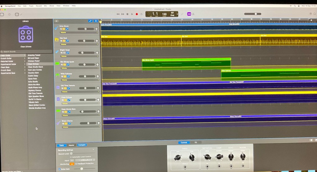 First up, a crazy synthesiser guitar sound on one of the guitar parts. I knew I could change this anytime. Included it on here this morning to show the experiment with this particular track. Then went ahead and changed it to a cleaner guitar sound. Same guitar recording being played on this small riff. Didn’t have to play it again.