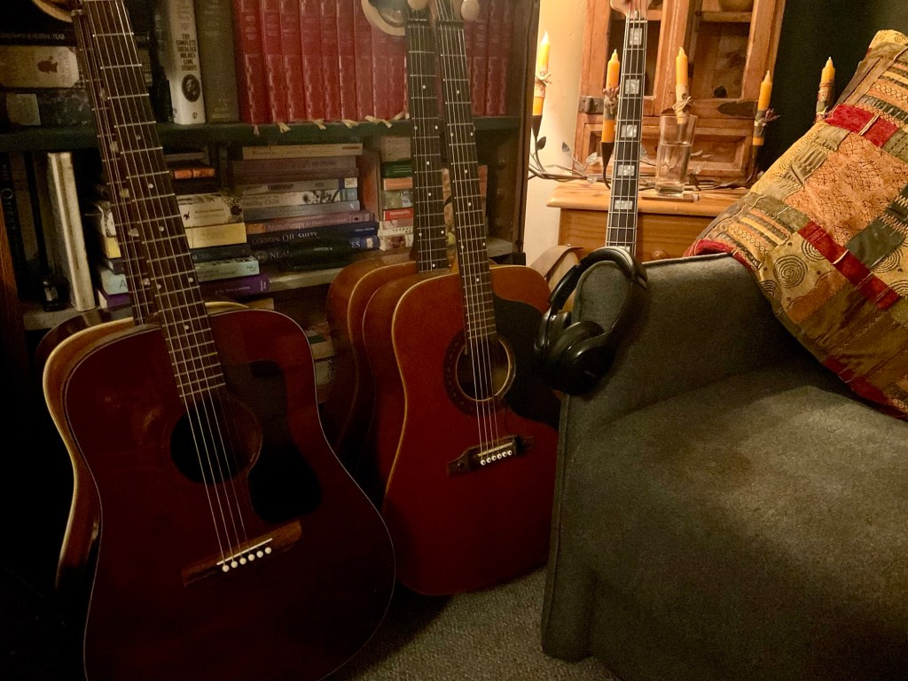 I played this song in my teenager years little box bedroom around 1969 on an old acoustic guitar. Here? Played in ‘The Den’. We all have our favourite room do we not? So here is an insight into mine. My ‘Den’. My equivalent of a ‘Man Shed’. A Nirvana space to settle the heartbeat into a gentle calm. Dark outside the window. Warm inside my heart.