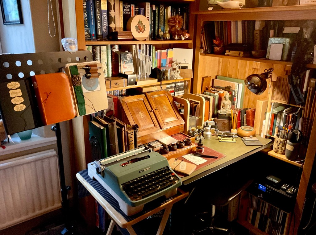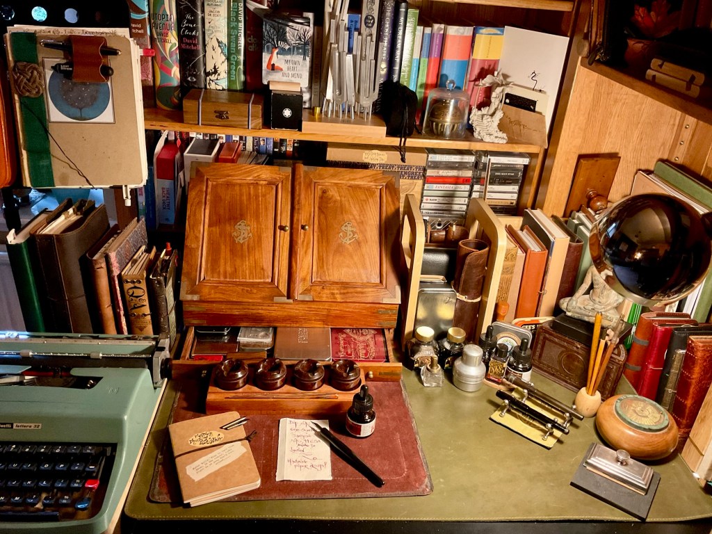 Put very many makes of dip nibs into the lovely desk top writing container. It was recently bought for me by my wife Angie. Currently all in those metal boxes. Behind the two doors it currently houses various sheets of handmade Khadi paper and envelopes. So the intention is to write letters to people and also doodle stuff for fun.
