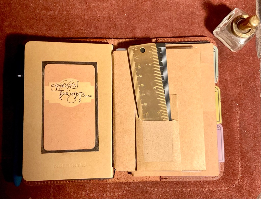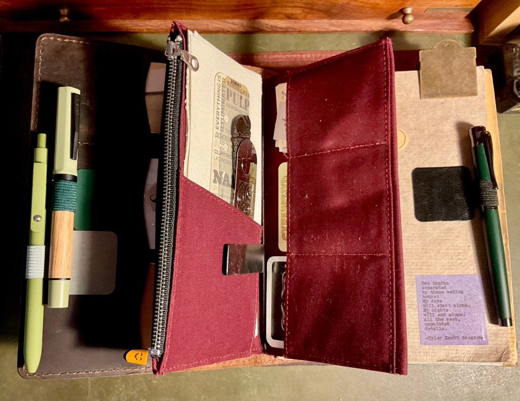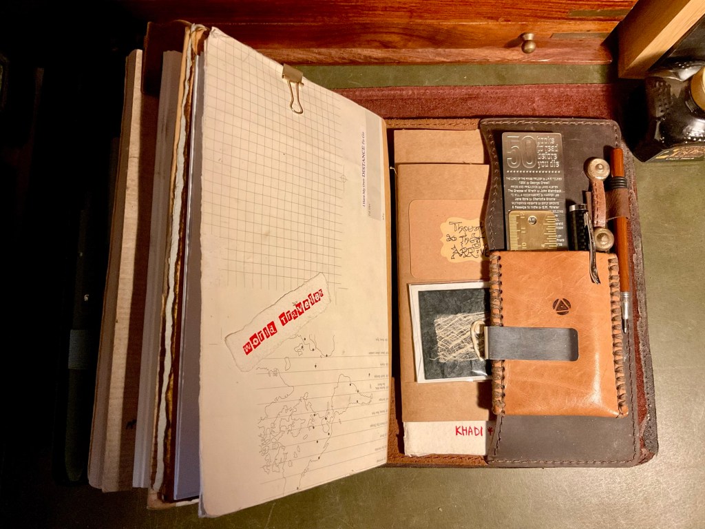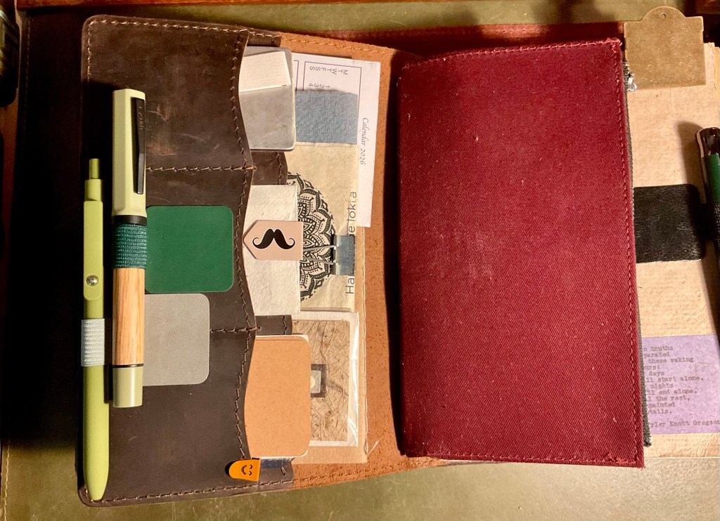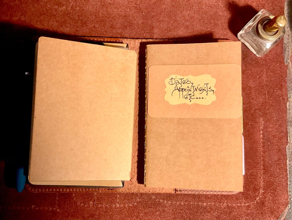 Above. The Newestor leather journal cover. My main daily go to. It can also house small notebooks inside the front and back pockets of the leather cover. This bulky journal was often taken in my Musette canvas/leather/brass Man Bag. Sitting in a local cafe, or in the VeeDub, it was there on the table being used. I need to get back out there. It is nice that the two larger journals can easily be taken out, (housed under elastic retainers) and interchanged with other journal themed choices. Maybe even watercolour paper pads.