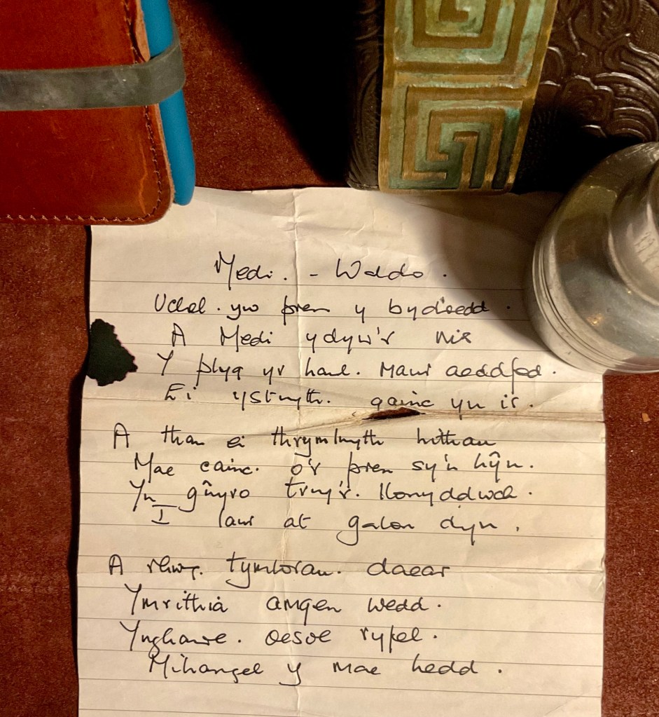 Also found a poem by Waldo Williams called ‘Medi’. Written with a fountain pen by someone who must have admired the poet’s work. It was hidden behind the bureau’s drawer.