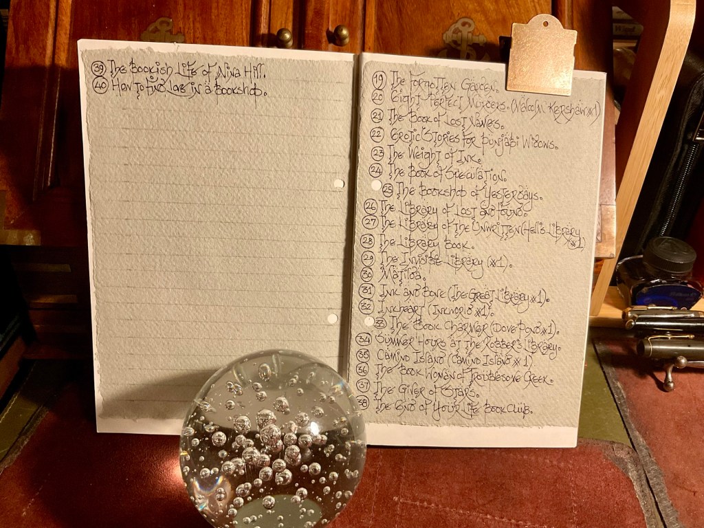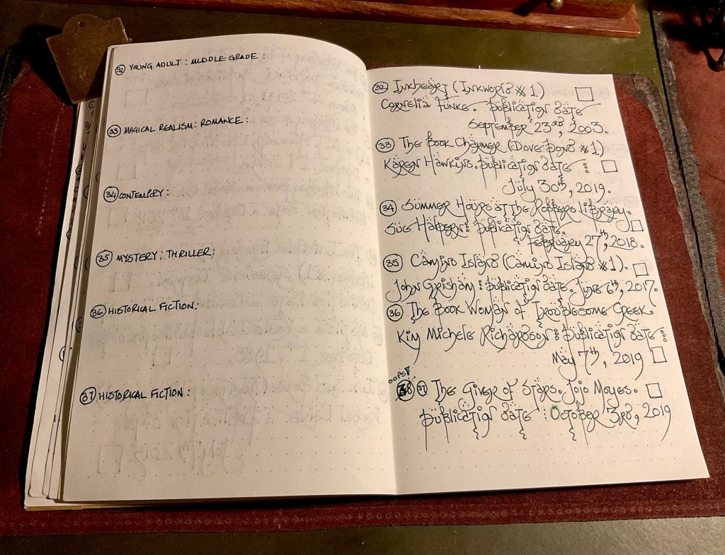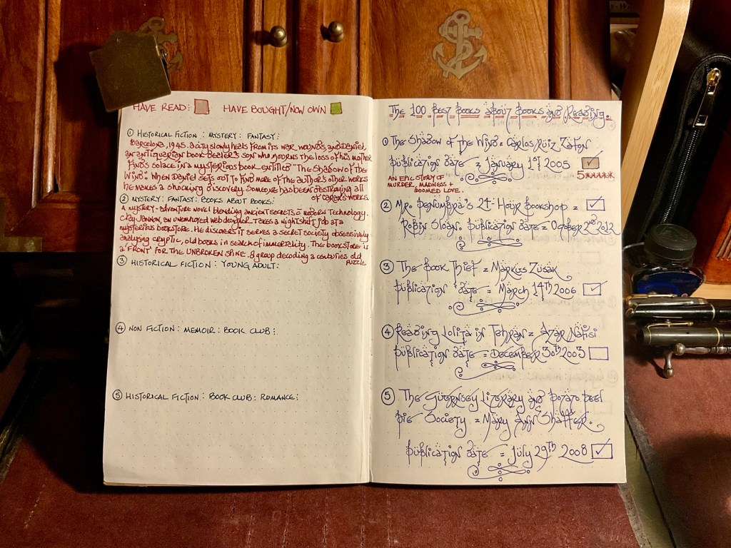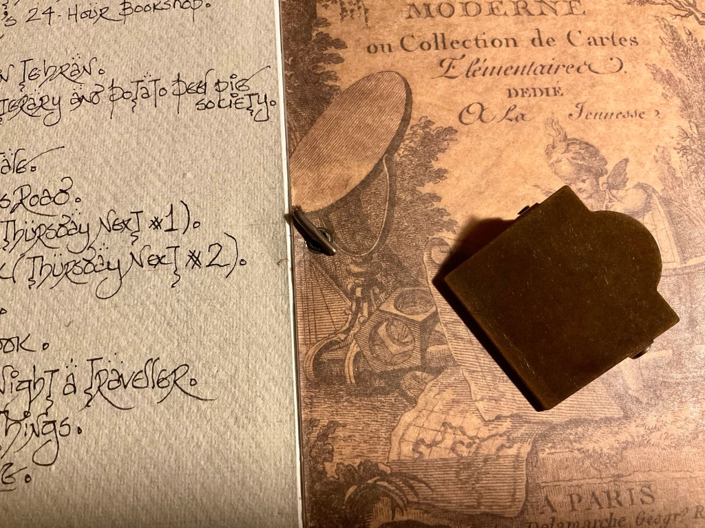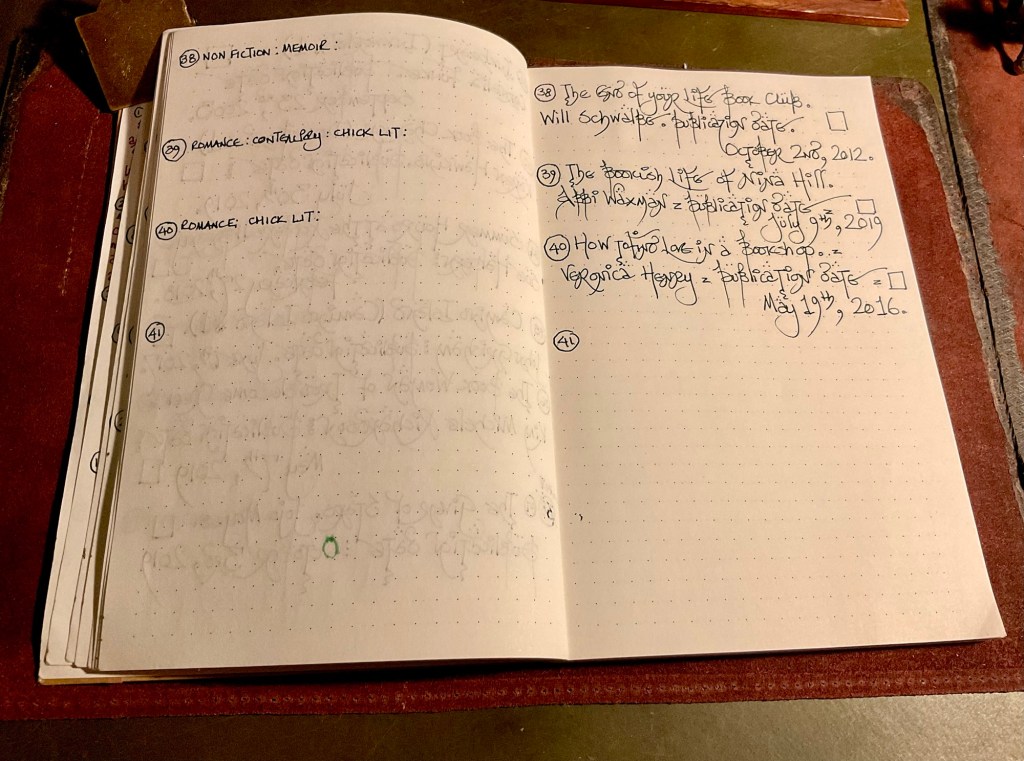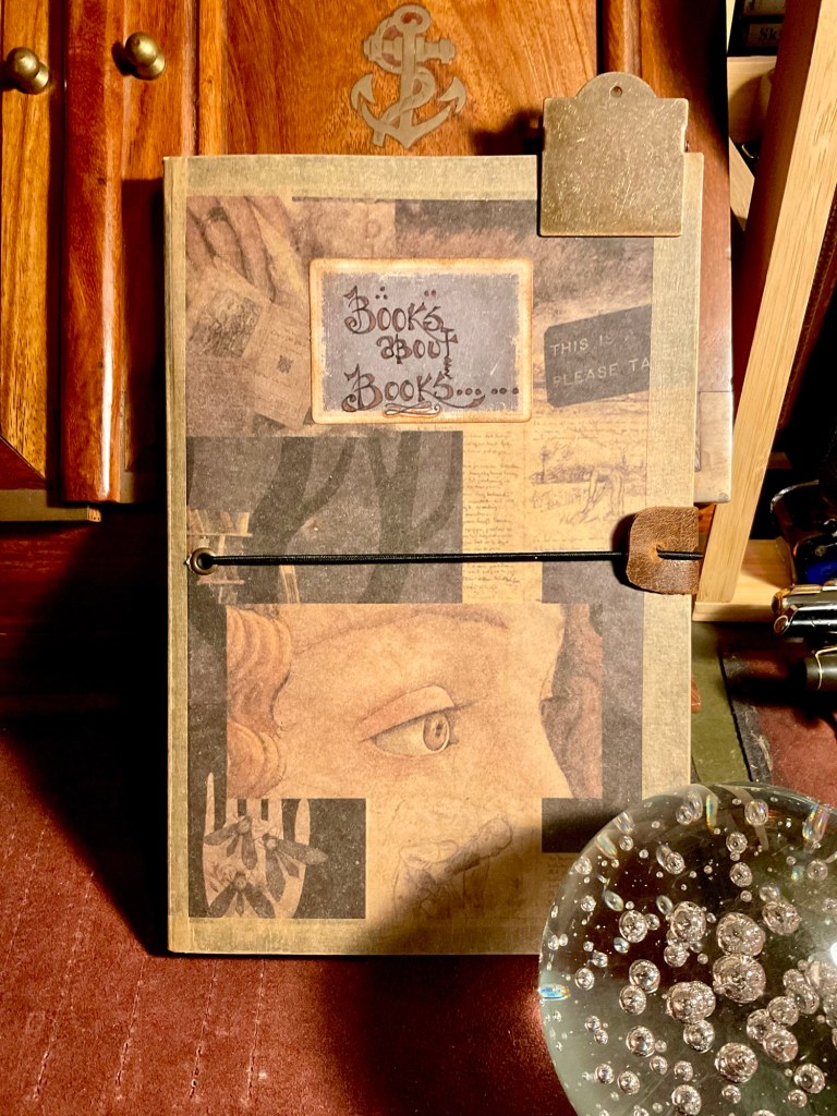 I bought a cheap bullet notebook from a charity shop. The front cover was bright and artistically in your face. Nevertheless, it held fountain pen ink very nicely. So the lists of ‘Books about Books’ started to get entered into the ink friendly pages.