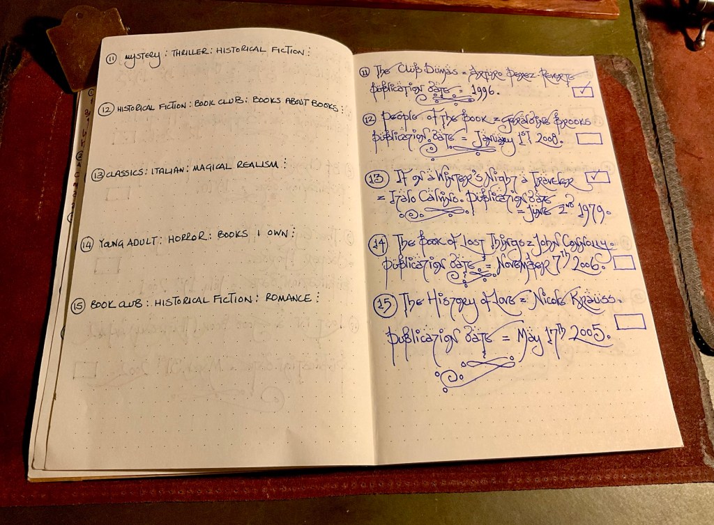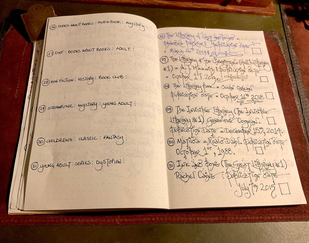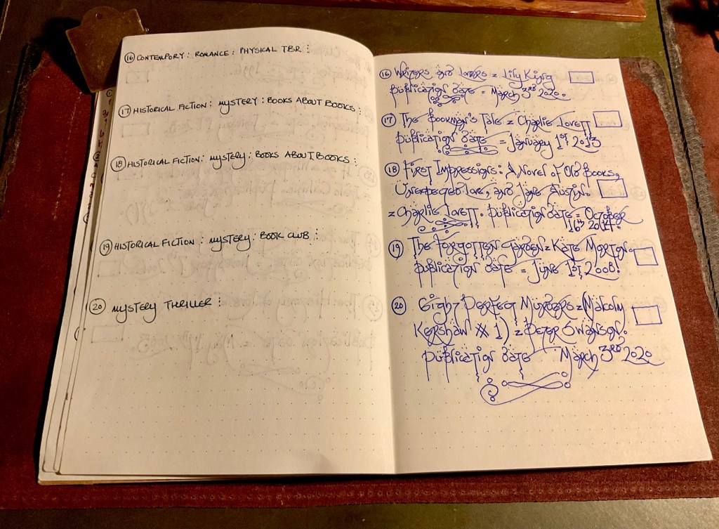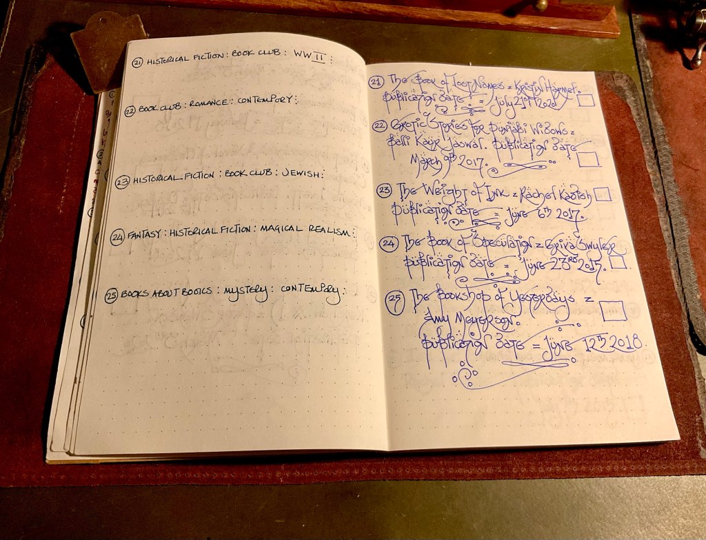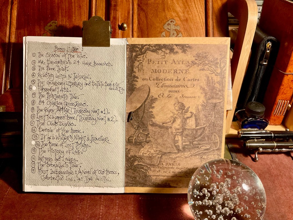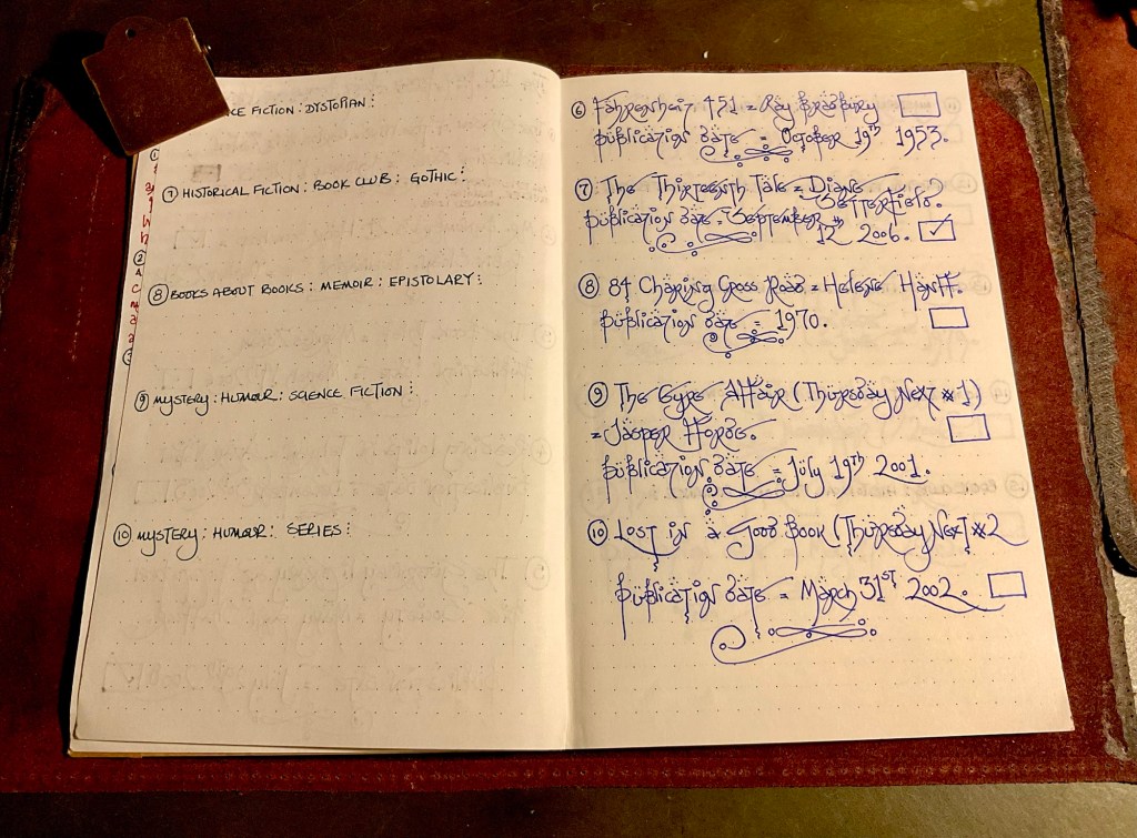 I bought a cheap bullet notebook from a charity shop. The front cover was bright and artistically in your face. Nevertheless, it held fountain pen ink very nicely. So the lists of ‘Books about Books’ started to get entered into the ink friendly pages.