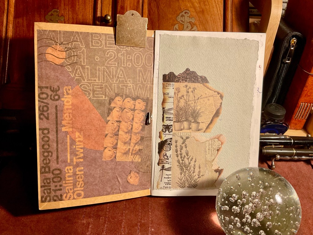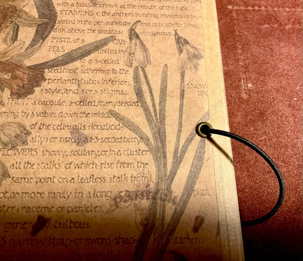 Pritt stick glue, Kraft brown paper sticky tape, Washi tape, Amazon ideas for ‘sticker and vintage imagery enhancing artwork (or whatever rocks your own boat visually) that people put into Bullet Journals, eyelet kit to strengthen mounting places with elastic lengths to create a ‘stretch wrap around your journal’ safety band, and just a bit of other inspirational add in’s. I use these brass ‘clamps’ seen on the journal, as weights to hold the notebook flat when writing. I ‘punch stamp’ out circular holes with a cheap metal hole punch to house the elastic stretch bands. Crimping metal ends hold the elastic in place. Sometimes, inside front and back covers, it is nice to glue in artwork too. Also little cardboard secretarial holders. Places to put some small ephemera like receipts, favourite photographs, small clippings from newspapers/reviews or business cards. .