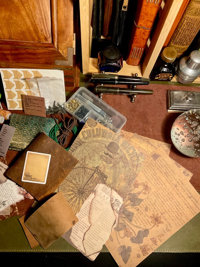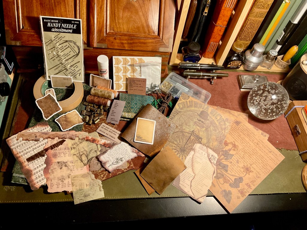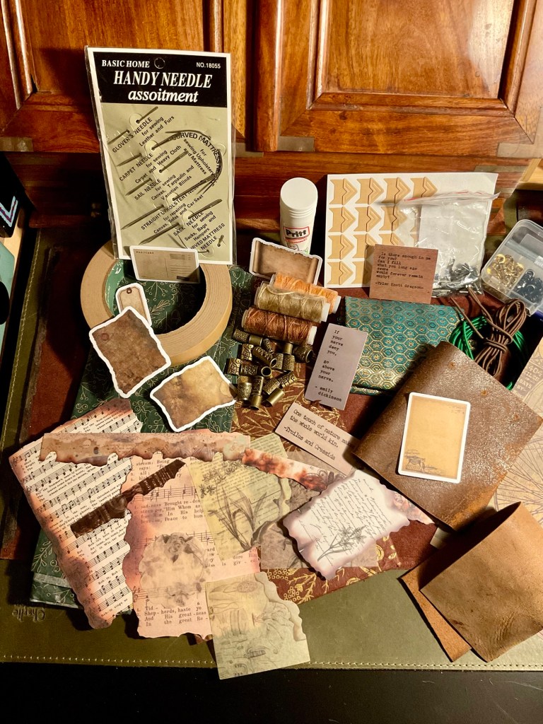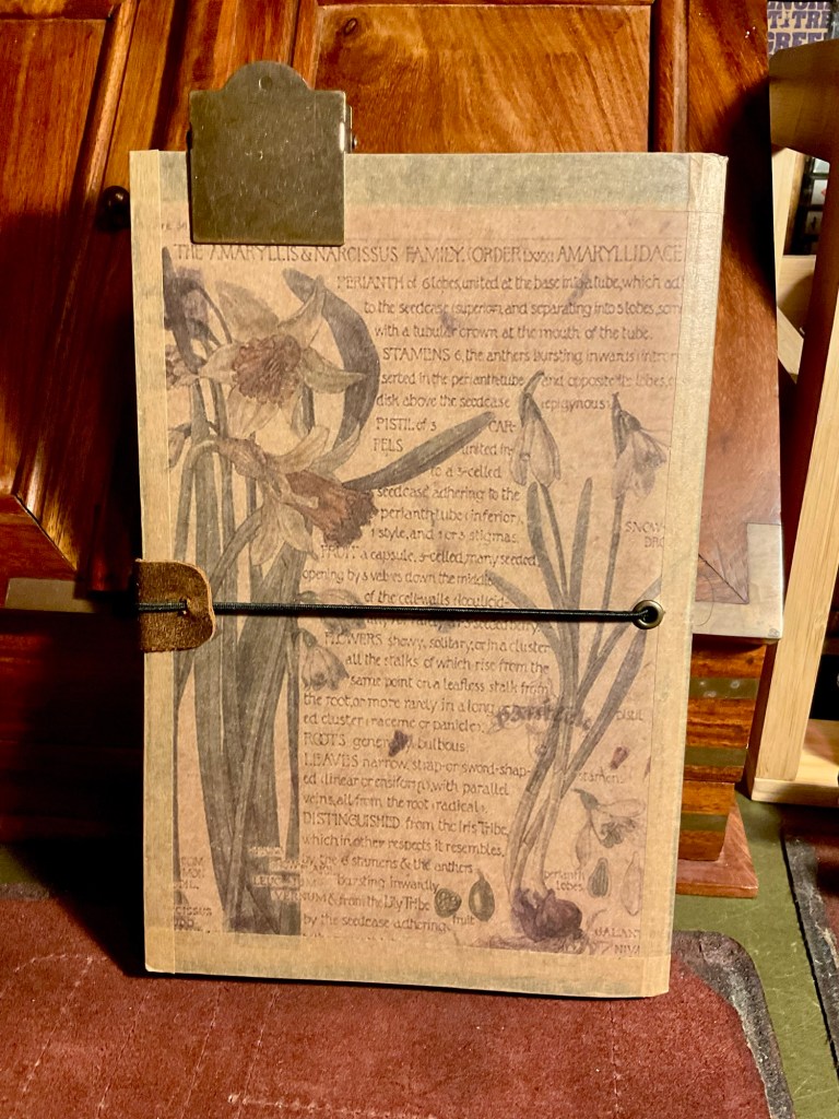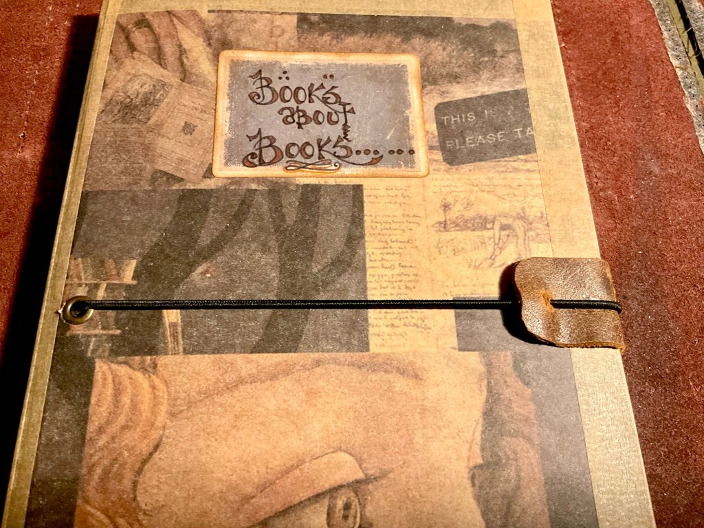 Back to the current ‘Books about Books’ notebook of lists and information. The cover? It grated. Tawdry and in need of softening. So, with the bits and bobs I use to enhance my other journals, I decorated it.