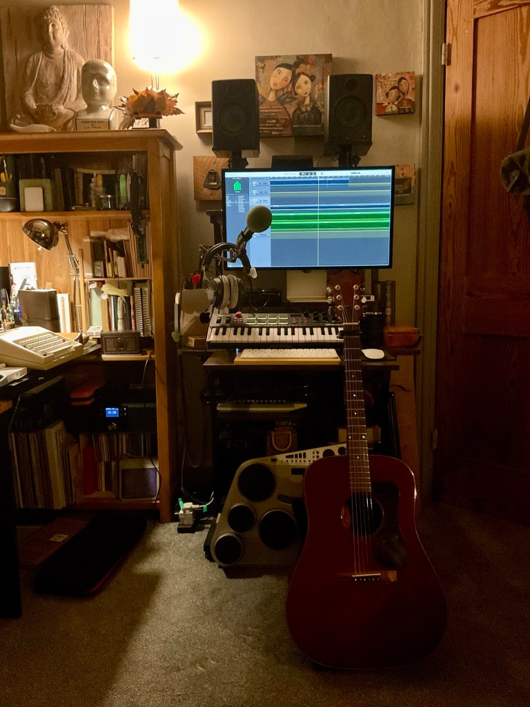 It was intentional to add a whole load of echo to this song below. Basically, the idea was to grab this opportunity quickly and give myself an instant therapeutic shot of sound vibe. When you feel low in mood, a guitar can be really helpful. It’s so good to be able to switch on the Mac computer, open GarageBand, simply open a ‘New File’, pull the microphone in front of your face and guitar, strum a starting up exercise of a very simple strum and melody to yourself to bring calm. This one below is a very short song that I wrote years ago. Way back then, it was for an intentional ‘pinned’ WordPress introducer on a ‘header page’. Of course, it never happened. One day maybe. But it served a purpose here in bringing a bit of calm. It was nice singing ad hoc harmonies to my own voice. Not great keeping in tune wise …..but fun.