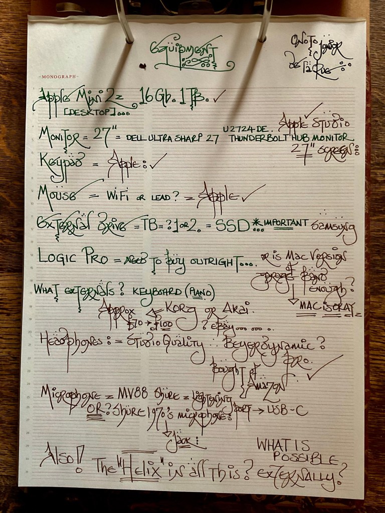 Having now received the Apple set up of Studio screen monitor, Mac M2 Pro mini desktop computer, Qwerty keypad and WiFi mouse, the next step was to find a decent set of headphones to listen to what is being recorded, produced and mixed in a clear and clean effective audio way. Getting clarity to the bass, middle and top note/tone/frequency sounds. Also, a linked in keyboard to add little musical extras played on ‘piano’ keys.