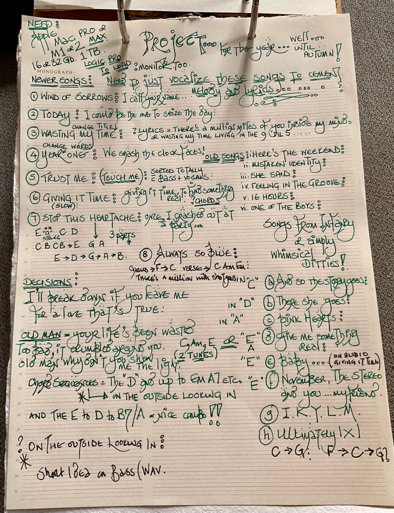 Thank the stars for a Bass Guitar and a bunch of self written songs. Ongoing dipping in and out of various lyrics and melodies to get at completion of the new songs.